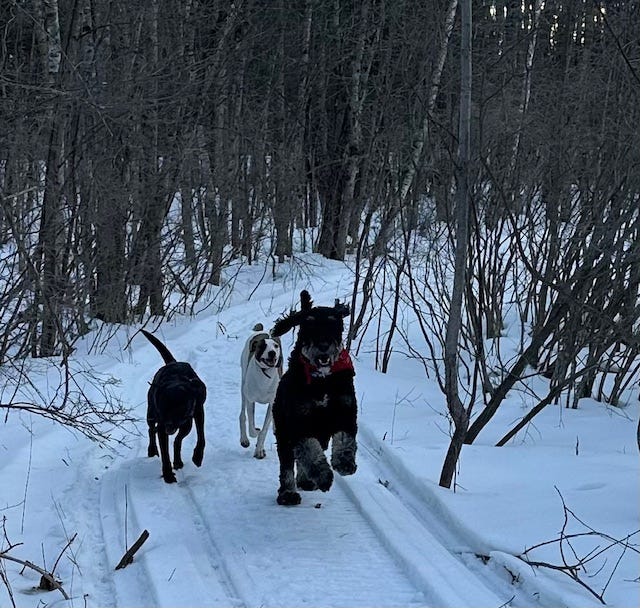 Having a dog in your house makes life very lively. It keeps you moving and active which has been good for both of us. The challenge with a young dog is getting all the energy out of them. I recently got together with my friend Marilyn Swan and her two dogs, Mollie and Charlie. We took them for a walk on Marilyn’s property off the Sunday River Road. Those three dogs had a great time and it was an awesome walk. Spending time with a good friend and having those three dogs run their tails off was just perfect! Life’s simple pleasures are always the best!