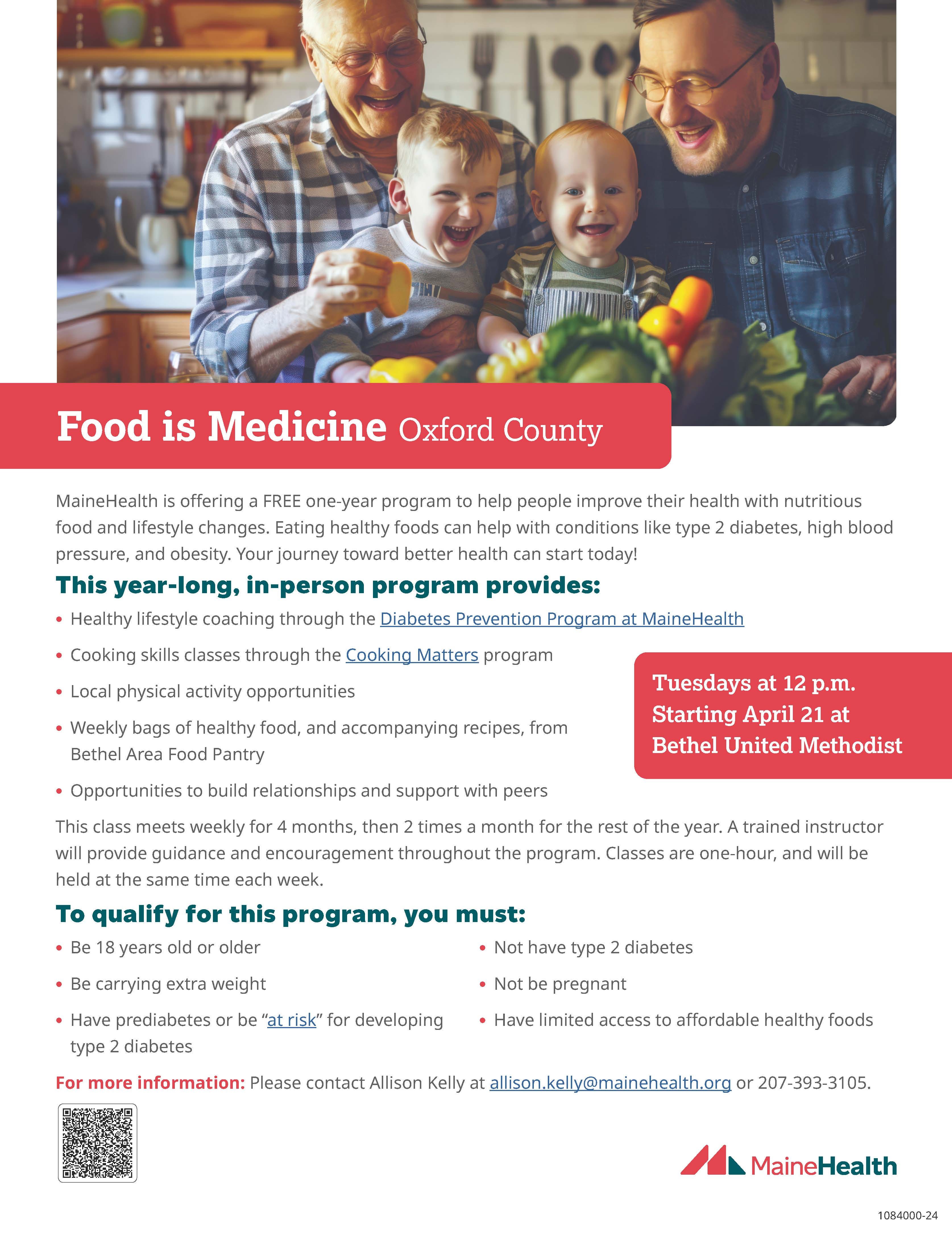 There is a free year-long program starting up on April 21 at the Bethel United Methodist Church. Called “Food Is Medicine,” it is designed for people who are at risk for Type 2 diabetes, and who have limited access to affordable, healthy foods. See details in the flyer below.