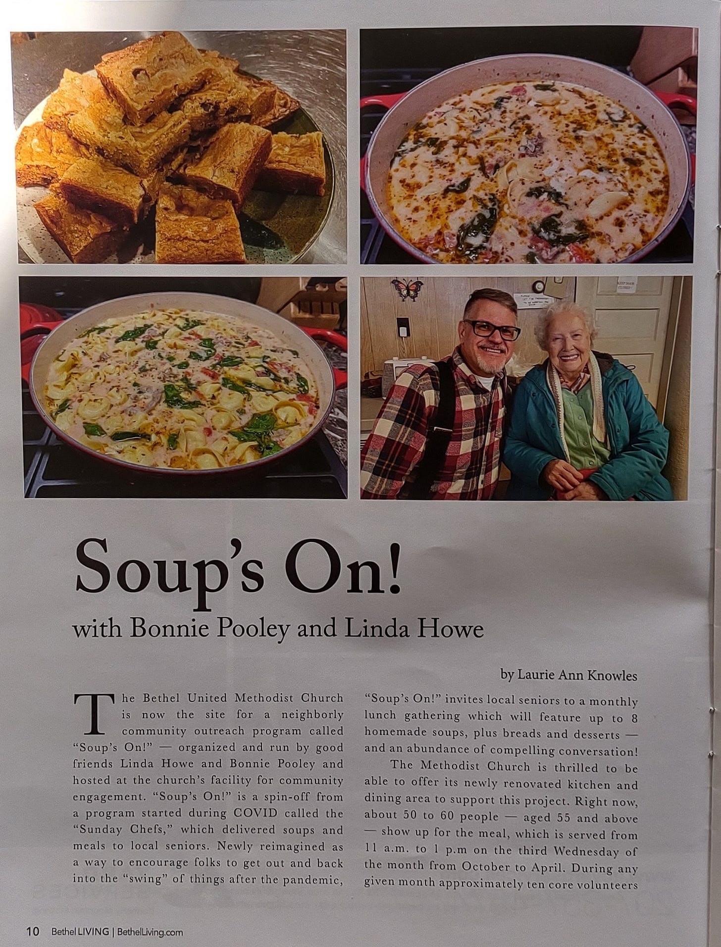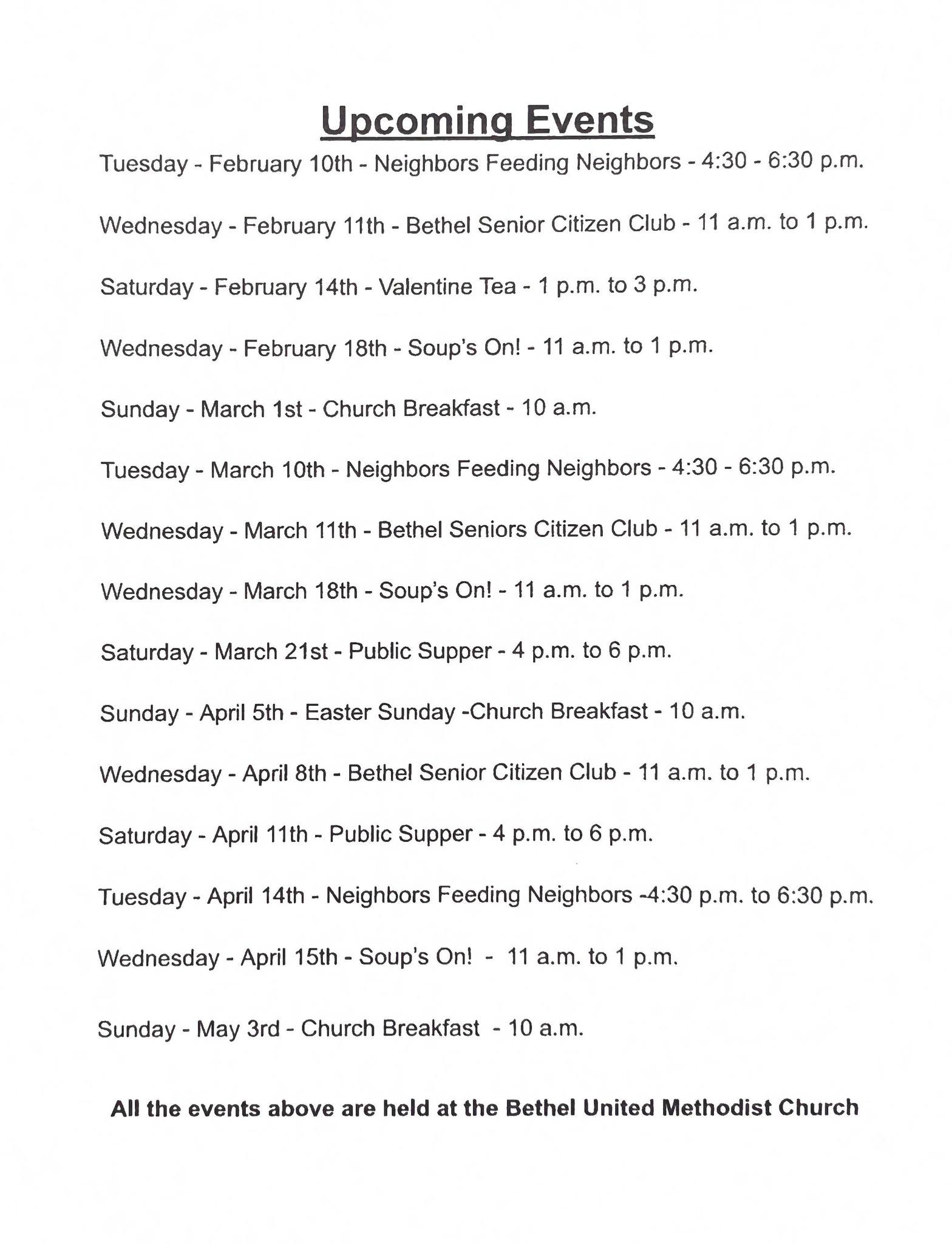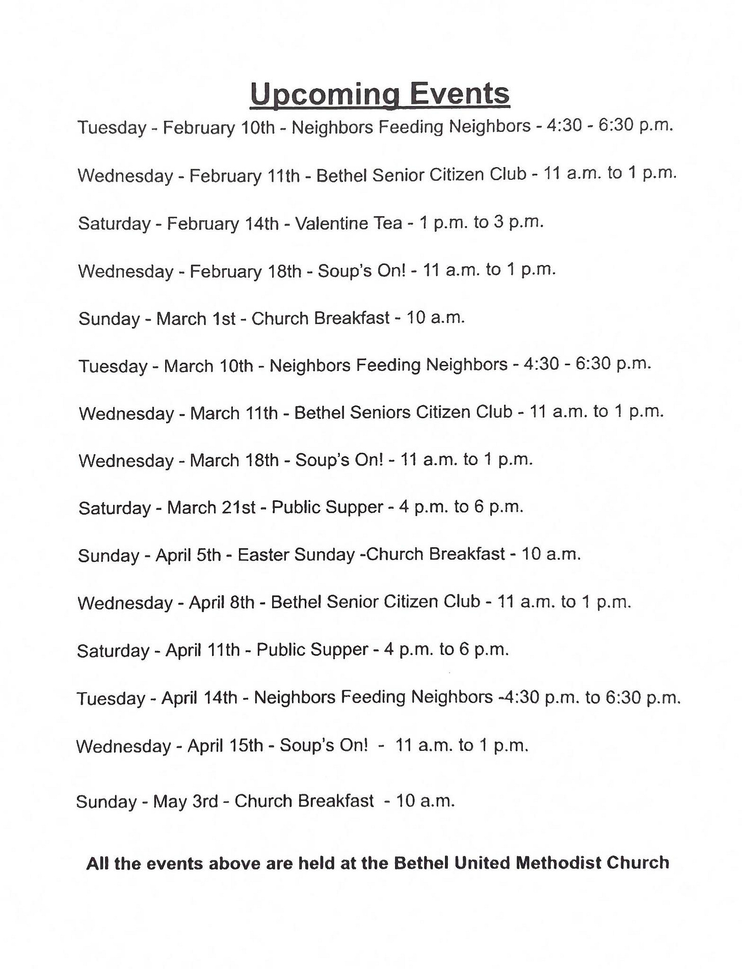 I ask all of you to take a moment to think about how much the Methodist Church is involved in various community events. We have become so accustomed to it just being there. Neighbors feeding Neighbors, Bethel Seniors Group, Soup’s On, yoga classes etc. all call the Church their home.