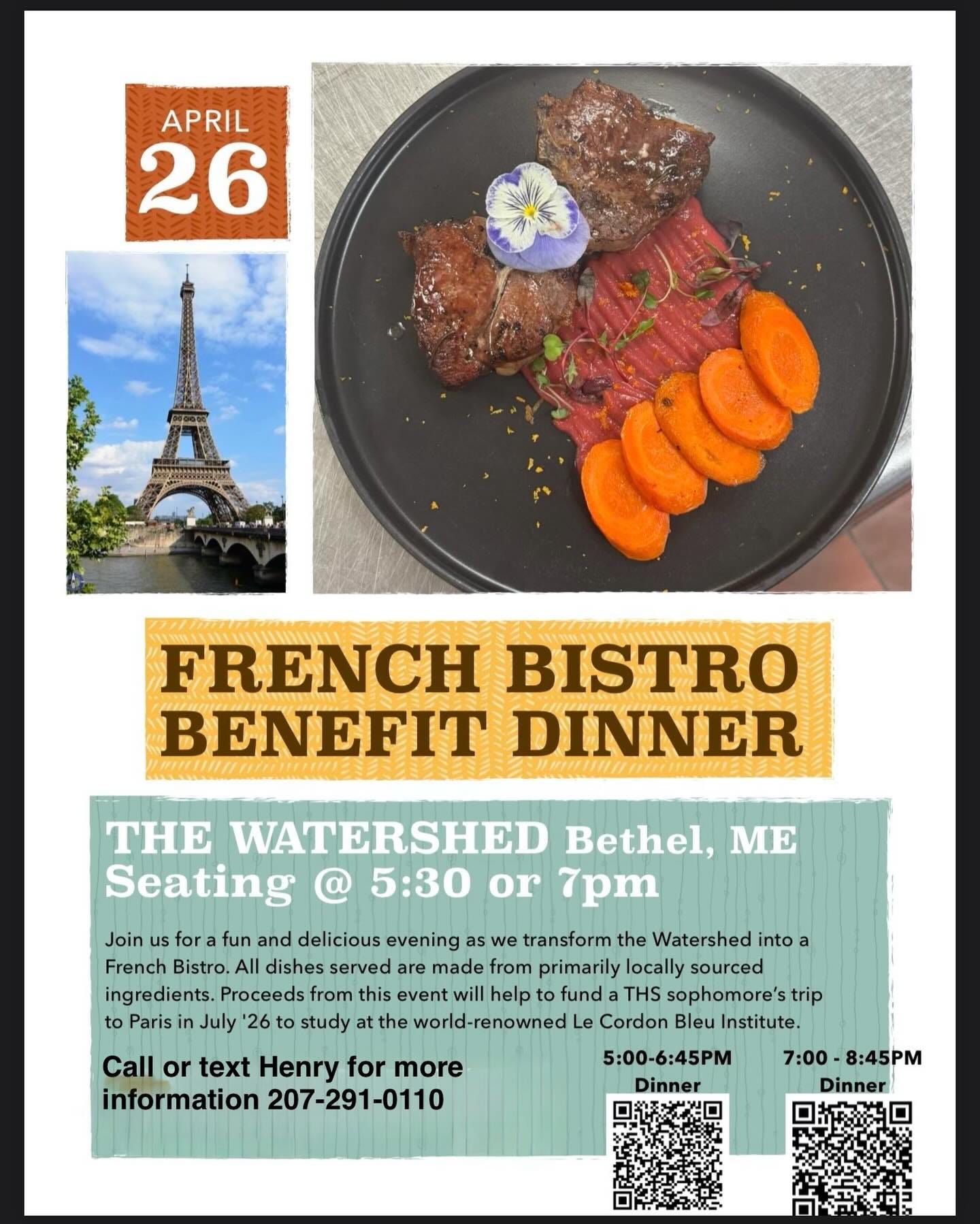 At the last Bethel Seniors Group meeting, the students from the Culinary Arts of Region 9 served us a three-course meal again. It was absolutely amazing and delicious. Therefore, I was so happy to see that our local Watershed Wood-Fired Kitchen is having a fundraiser/benefit dinner for our Telstar sophomore Henry Perks to travel to France to further his culinary career at the Le Cordon Bleu. On April 26th the Watershed Wood-Fired Kitchen will turn into a French Bistro from 5:30 till 7 in support of Henry. Please, if you can, support this young man. Call or text Henry for information at 207-291-0110.
