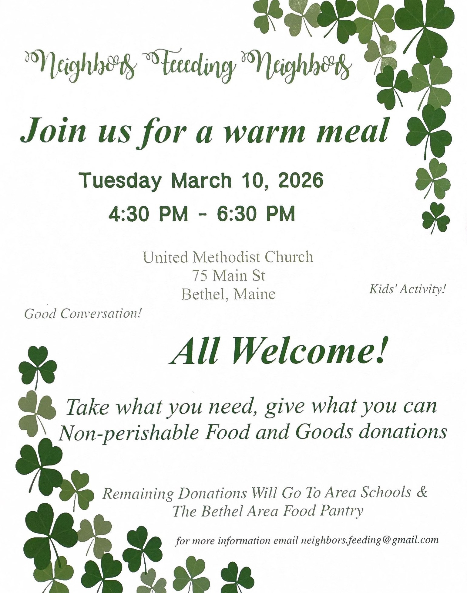 On Tuesday, March 10, from 4:30 p.m. to 6:30 p.m. is Neighbors Feeding Neighbors. This is a free event where community comes together to feed one another and also bring awareness to the Bethel Food Pantry. Folks can bring non-perishables to the Church which will be brought to our local food pantry.