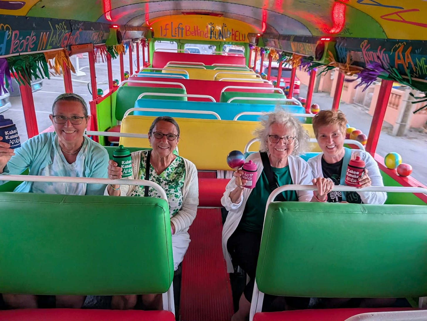 On St. Patrick’s Day, we were prepared with our “green” shirts. We went out that evening on the KuKu Kunuku bus. What a hoot that was! We were the first to be picked up. We climbed aboard an old school bus—no windows, brightly painted, and maracas stationed nearby so that everyone could participate. Music blasted as we drove on, stopping to pick up passengers.