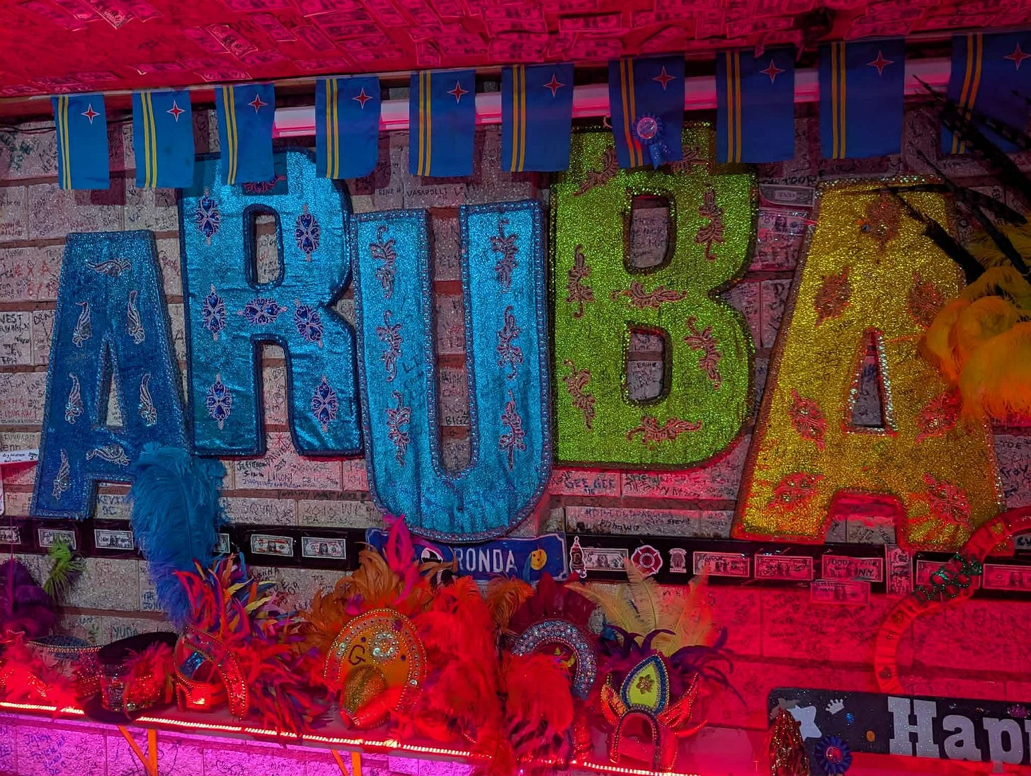 We were given a cup with a rum punch (not our favorite), and made stops at three different bars. At each stop, we exited the bus and went in, where we could buy a drink if we wanted, or just hang out and dance. Dancing was the best part! We were the last to get off the bus, and it was close to midnight, I think. It was a fun evening, and the party atmosphere just increased as the night went on.