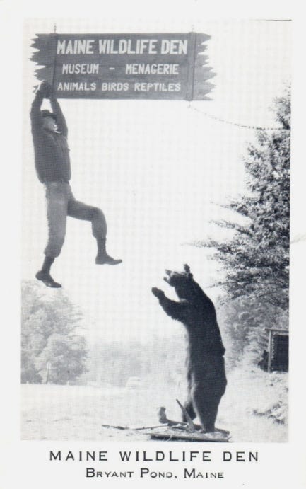 Some of us (who have lived here forever and are on the old side) have been reminiscing about Bryant Pond in the good old days. Just the fact that we had two grocery stores (an A & P, and MacKillop’s store—later Ken’s Market), is quite remarkable! I remember these places. There was a pay phone outside the market—a nickel for local calls. Inside was probably about anything you could want. There was also Dudley’s Store and Cole’s Hardware. The buildings for those still stand, though rather shabby looking. The Wildlife Den, run by Gil and Liz Whitman was right beside where the Buck’s Ledge Trailhead is now. That was a very interesting place, with different creatures on exhibit it. This town was really a happening place back in the day.